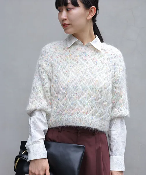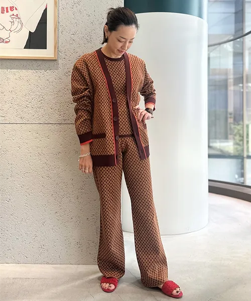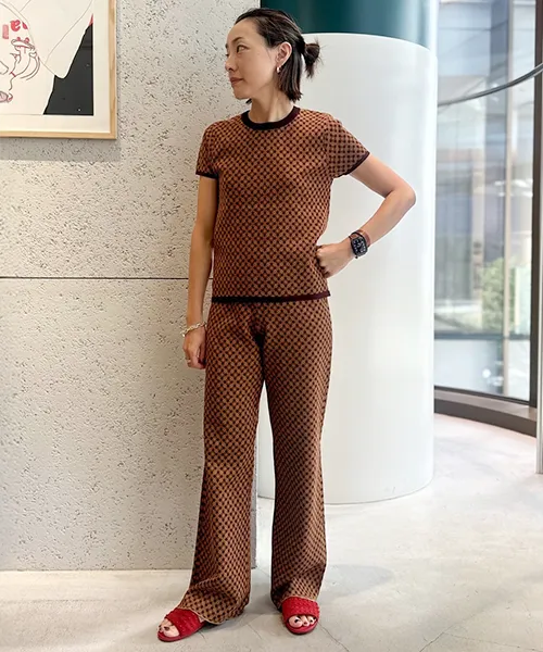ラメのきらめきが美しいシアーニットを主役にした、華やかさと落ち着きを兼ね備えたスタイリング。ほんのり透け感のある軽やかな素材が、シンプルながらも奥行きのある表情を演出。深みのあるブラウンのワイドパンツがトップスのきらめきを引き立てながら全体をシックにまとめてくれます。