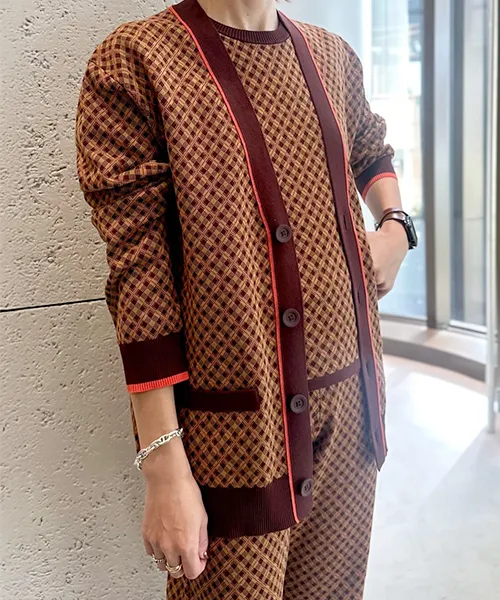 アイキャッチで遊び心のある〈CABaN〉らしい配色がポイントで、チェックをバイアスに使用したオリジナルのジャカード柄シリーズ。ボクシーなオーバーシルエットのVネックカーディガン、コンパクトなプルオーバー、セミフレアシルエットのニットパンツをご用意しております。