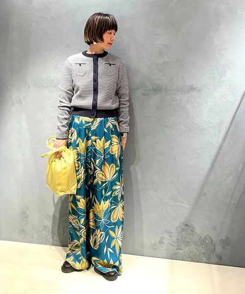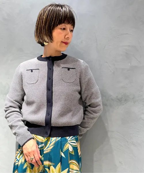 CABaN人気の定番アイテム「コットンカシミヤ クルーネックカーディガン」にボーダーが仲間入り。細いピッチのボーダーはカジュアルすぎず、きれい目スタイリングにもおすすめ。パイピングのネイビーが華やかなプリントパンツとのスタイリングを引き締めてくれます。