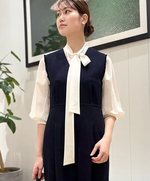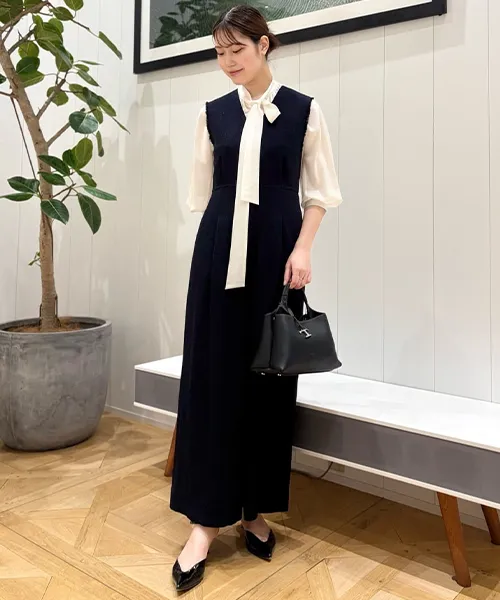 落ち着いたグレーのワンピースに、ネイビーのジャケットを肩掛けしたクラシカルなスタイリング。ウエストから入ったタックが立体感を生み、シンプルながらも女性らしいシルエットを演出してくれます。ジャケットを羽織ればオフィスやフォーマルなシーンに、ワンピース一枚なら軽やかにデイリー使いにも対応できる万能アイテムです。