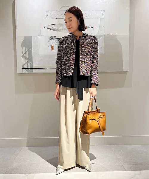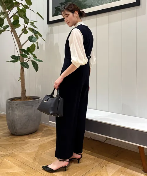 レーヨンとウール素材の軽やかなツイード生地のオールインワン。ラメ糸が入っているので華やかさがありつつも深めのVあきでマニッシュな雰囲気をプラスしています。綺麗めなブラウスと合わせて、オケージョンやビジネスシーンをイメージしたスタイリングにしました。