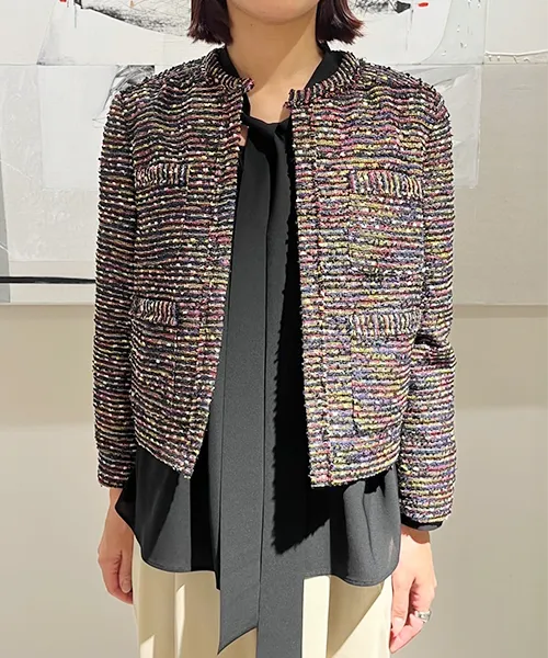 カラミ織りをベースに数種類の糸を織り込んで仕上げた、カラフルで独特な凹凸感のあるツイード素材を使用したジャケット。一枚で上品かつ華やかな印象でお召しいただけます。ワンピースやスカートとの組み合わせでエレガントな着こなしや、デニムとの合わせでカジュアルに着こなすスタイリングもおすすめです。