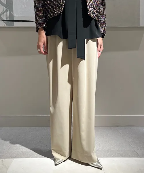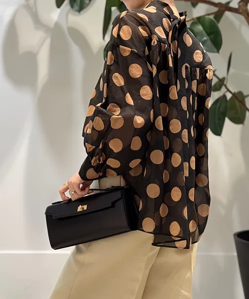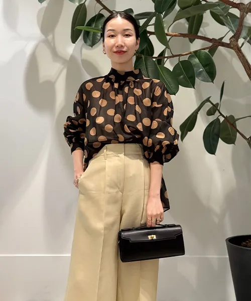 シアー感のあるドット柄ブラウスに、ライトベージュのワイドパンツを合わせたクラシカルなスタイリング。程よい透け感が女性らしさを引き立てるブラウスは、首元のスタンドカラーとギャザーで上品な立体感を演出。袖口のカフスがメリハリを添え、後ろリボンのディテールがさりげないポイント。