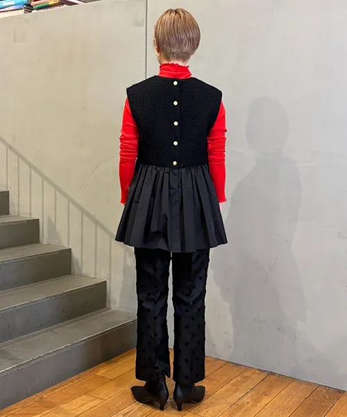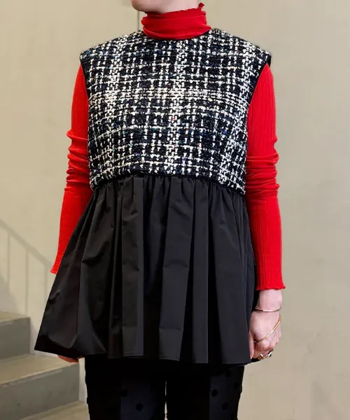 タータンチェック風のツイードと異素材の組み合わせが目を惹く、主役級ジレ。表情豊かな色の糸を織り交ぜたファンシーツイードは、フランスの老舗ファブリックメーカーのものを使用。フロンタブル仕様でシンプルなカットソーやブラウス、ニットに重ねるだけで2通りの表情が楽しめます。