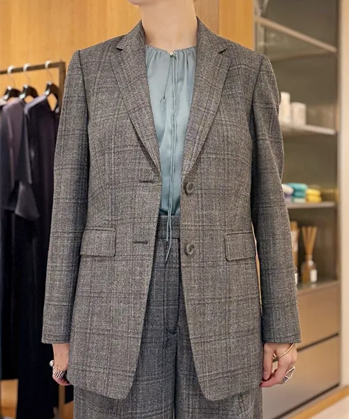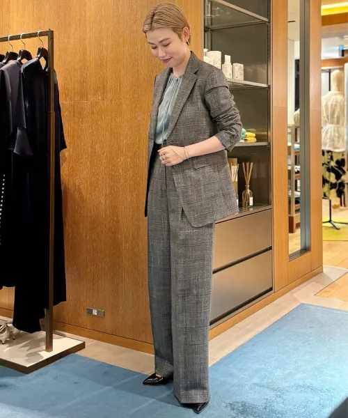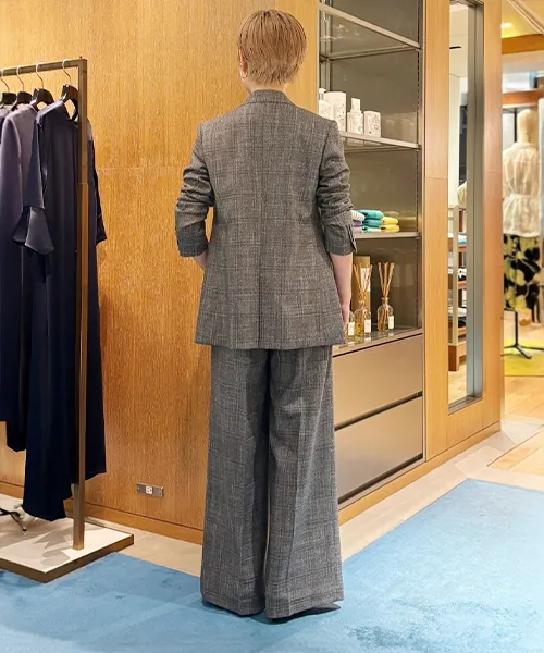 ロロ・ピアーナ社のウール・シルク・カシミヤをブレンドした贅沢な素材を使用したエグゼクティブ感漂うセットアップ。クラシカルなチェック柄は、メンズスーツのような品格があり、周りと差がつく存在感を放ちます。セットアップとしてはもちろん、ジャケット・パンツそれぞれ単品でも着回し可能です。