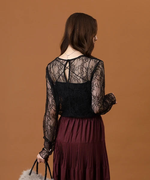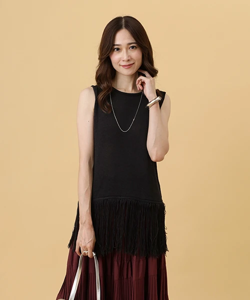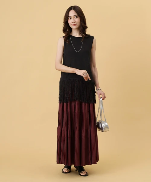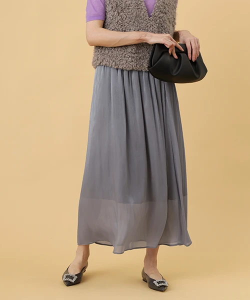 秋の始まりは、透け感のあるニットと柔らかに揺れるスカートを合わせて軽やかな印象に。煌めくニットのスパンコールとキラキラと光るスカートの生地感で、華やかにお出かけ気分を盛り上げる。