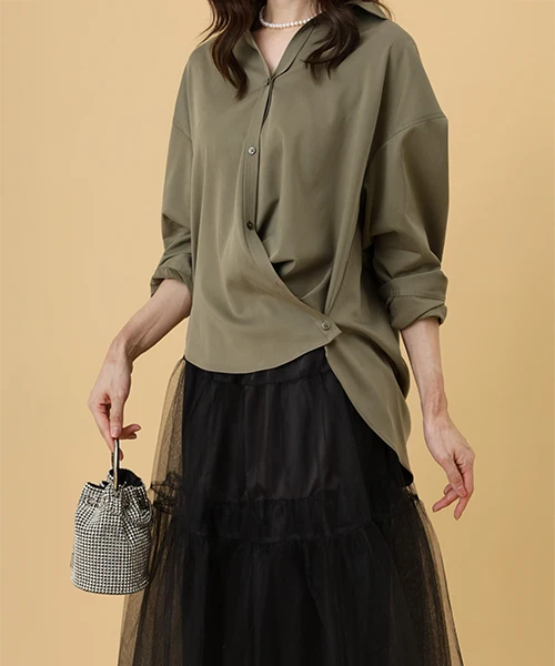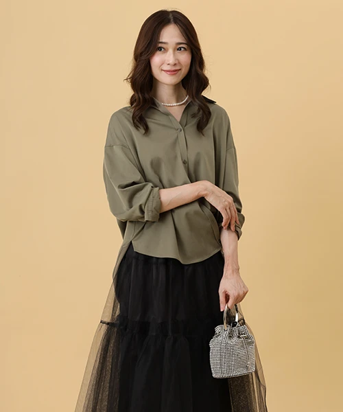 生地のツヤ感とゆとりのあるシルエットで抜け感があるシャツ。