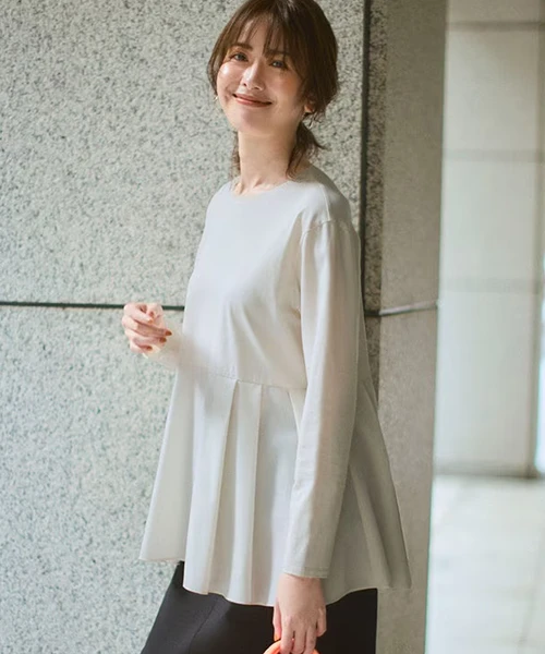 Aラインに広がるペプラムデザインが上品なカットソー。一枚はもちろん、裾のフレアーをポイントにしたレイヤードアイテムとして活躍する万能アイテム。