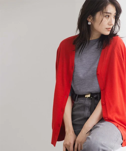 薄手の洗えるウールシルク素材のVネックカーディガン。シンプルデザインに共生地のくるみ釦がデザインポイントで、細部にまでこだわりを感じさせる一枚。