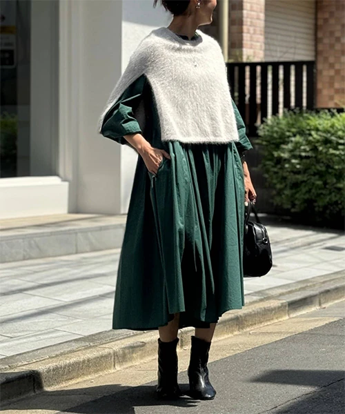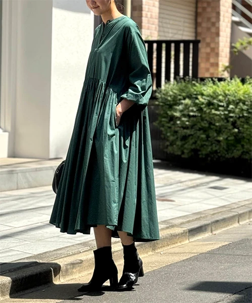 たっぷりギャザーに、フロントは比翼仕立てのすっきりとした上品で洗練されたワンピース。一枚で着映える存在感がありながら羽織やレイヤードで表情を変えられるのも魅力。