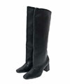 襟付セーターとドットプリーツスカートの組み合わせは、女性らしい雰囲気がベストマッチ。モード感のあるブラックのワイドシャフトブーツでメリハリをつけて、大人っぽさのあるフェミニンスタイルに。