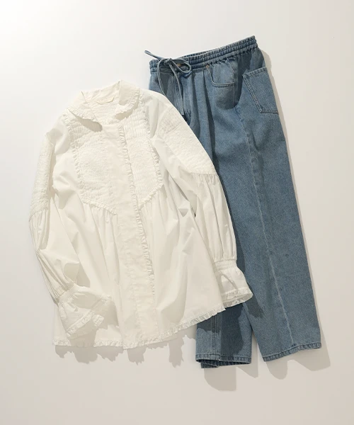 一枚で主役になる、フェミニンで存在感のあるブラウス。デニム合わせでナチュラルに、スカート合わせでよりレディライクに。