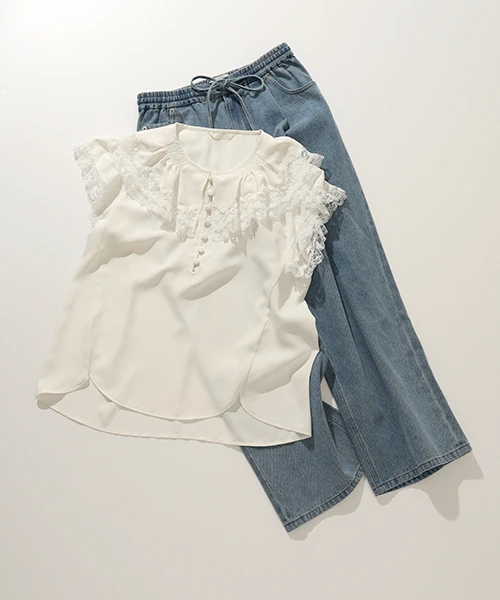 衿元のピコフリルで甘さをプラスした、カジュアルスタイル。きれいめなボトムスに変更して、オンスタイルにも。