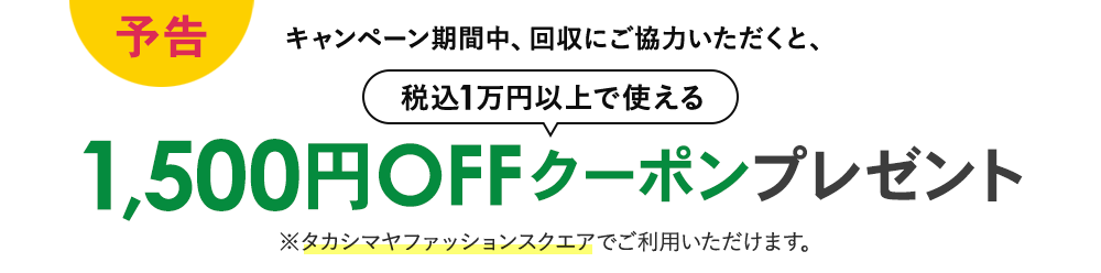 キャンペーン期間中、回収にご協力いただきましたお客様には、タカシマヤファッションスクエアにて、税込1万円以上のご注文にご利用いただける1,500円OFFクーポンをプレゼントいたします。