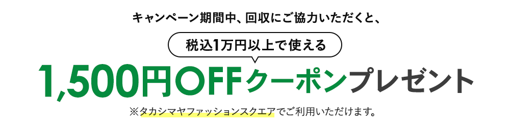 キャンペーン期間中、回収にご協力いただきましたお客様には、タカシマヤファッションスクエアにて、税込1万円以上のご注文にご利用いただける1,500円OFFクーポンをプレゼントいたします。
