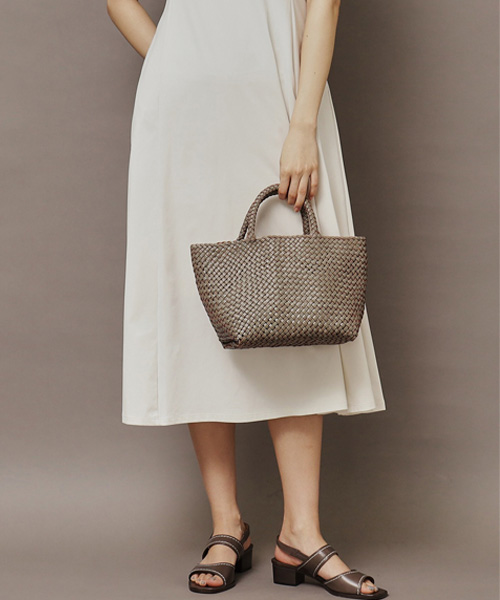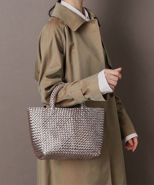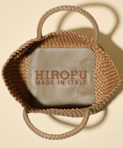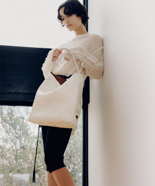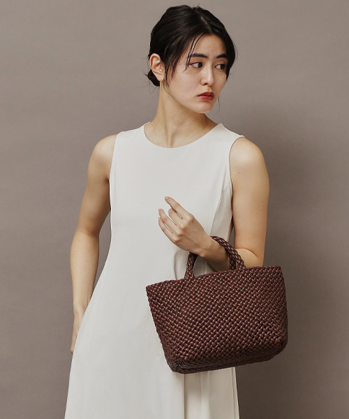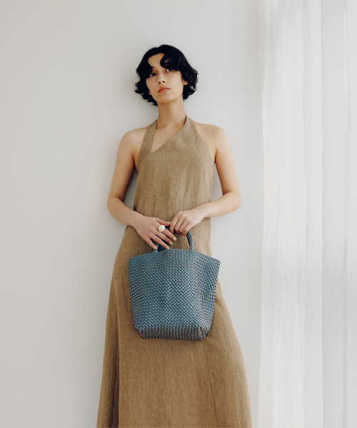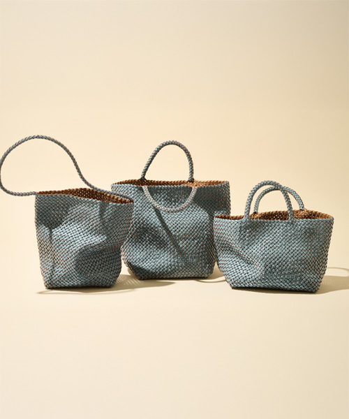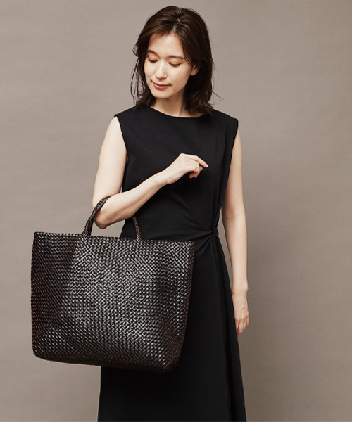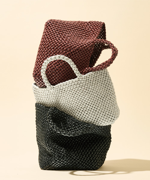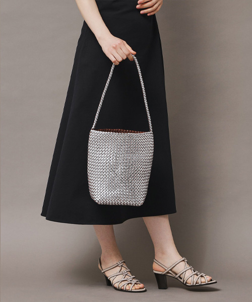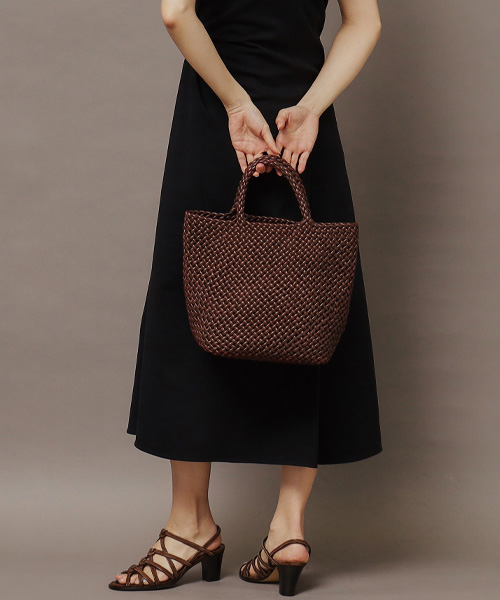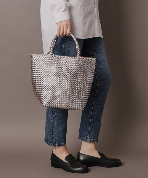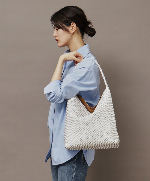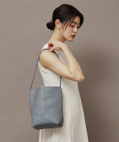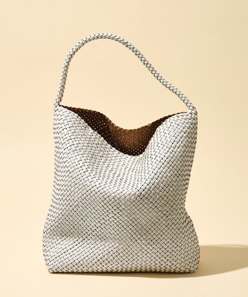 長いハンドルで肩にすっきりと掛けられ、荷物を入れると柔らかなシルエットが魅力。ハリのある一本の革を編み上げたデザインは使うほどに馴染みます。