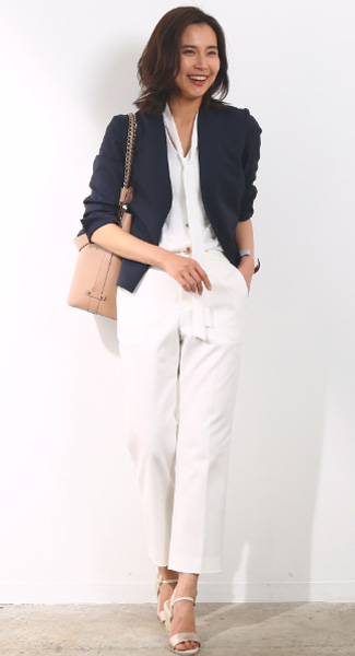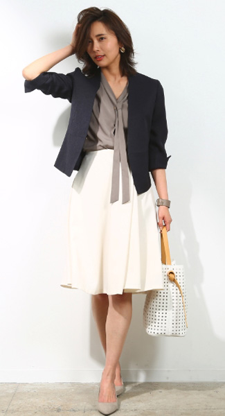 大人顔のボウタイブラウスでジャケットを洗練させて