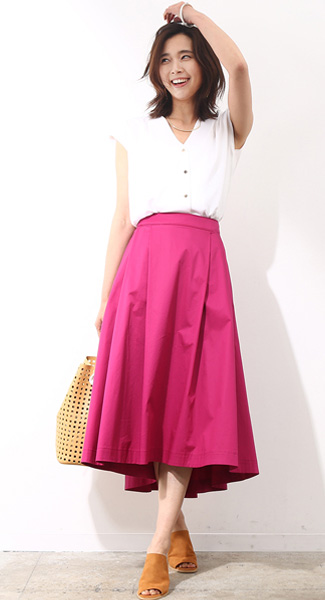 夏空に映えるベリーピンクは、クリーンなカラーと合わせて上品きれいに。