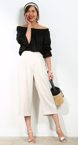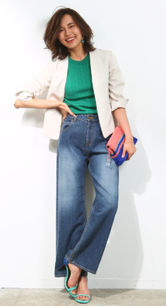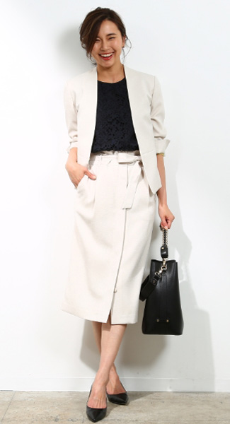 ナチュラルなセットアップは、ダークカラーのインナーレースを合わせてスタイリッシュにまとめて