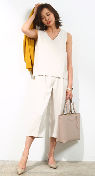 カジュアルにもハマるのはリネン調素材だからこそ、ビタミンカラーの差し色で遊び心をプラス
